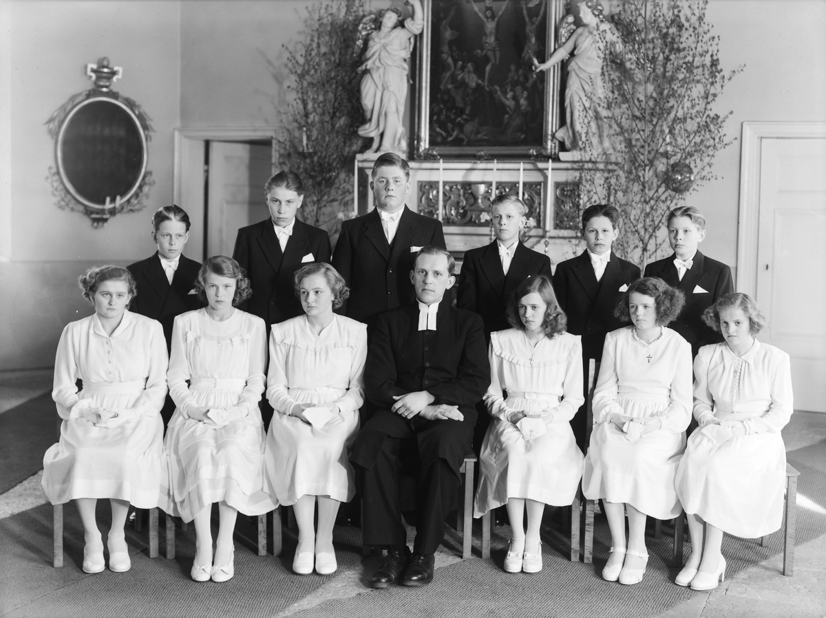 Konfirmation, 12 konfirmander och pastor Sven Dahlgren.