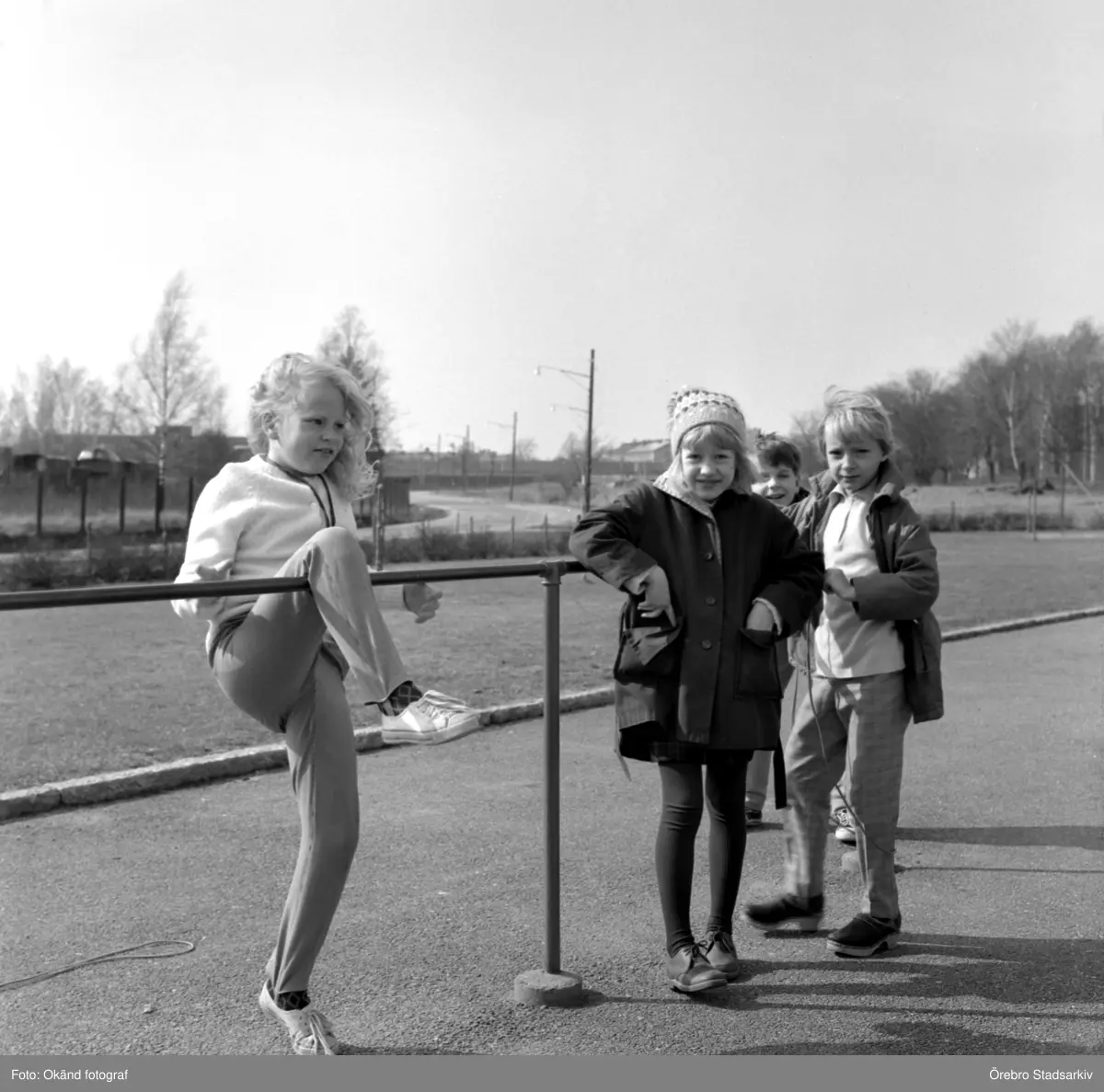 Flickor lutar sig mot staket på Södra Lillåstrandskolans skolgård, 1960-tal