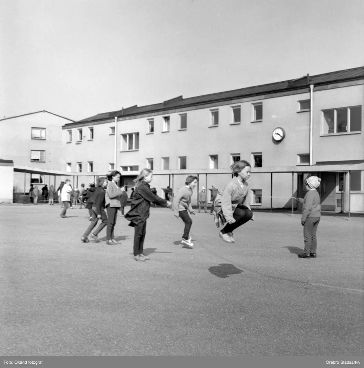 Flickor hoppar hopprep på Södra Lillåstrandskolans skolgård, 1960-tal