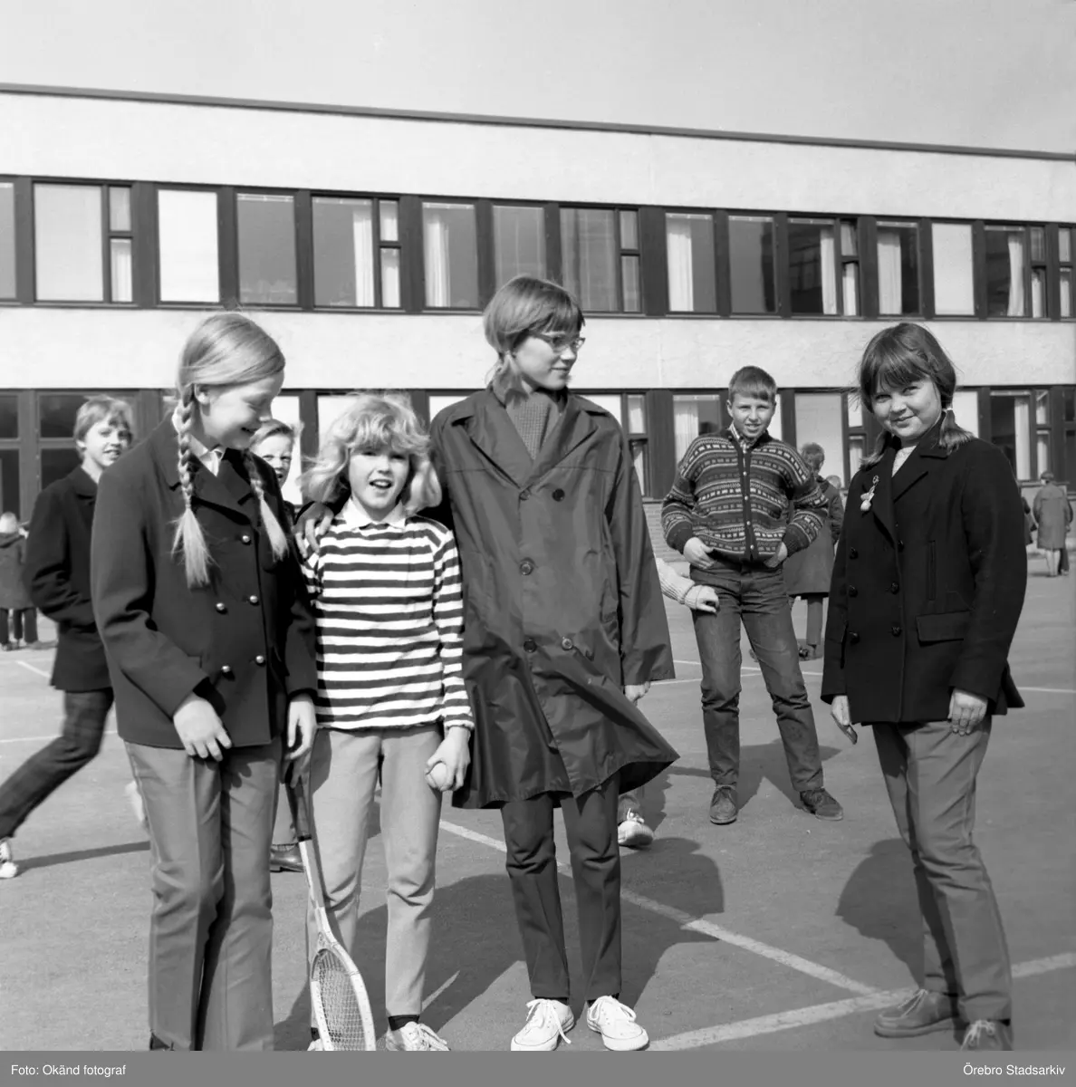 Elever på rast på Olaus Petriskolans skolgård, 1960-tal