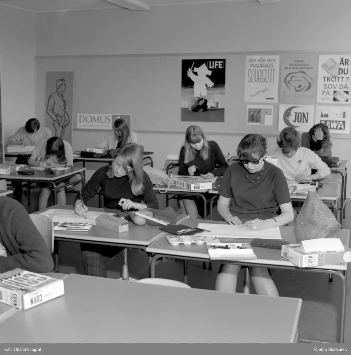 Klassrum på Virginska skolan med elever som målar, 1960-tal