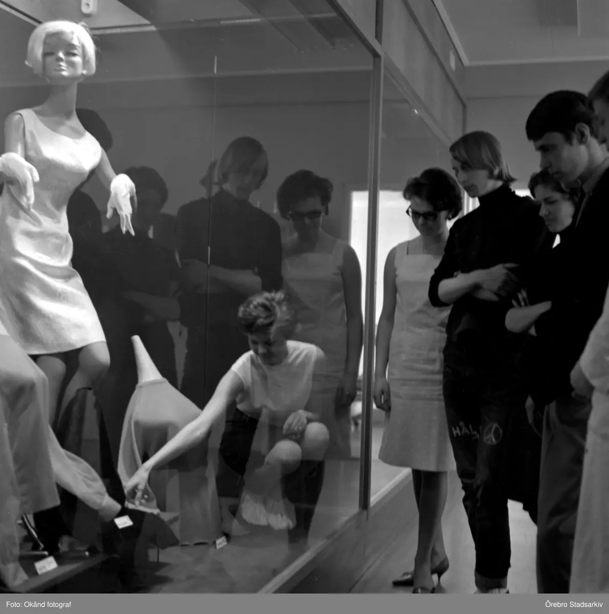 Elever gör skyltning med klädda skyltdockor på Virginska skolan, 1960-tal