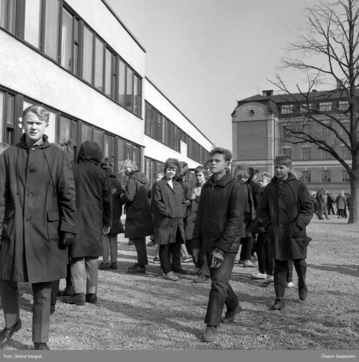 Elever framför kameran på Olaus Petriskolans skolgård, 1960-tal