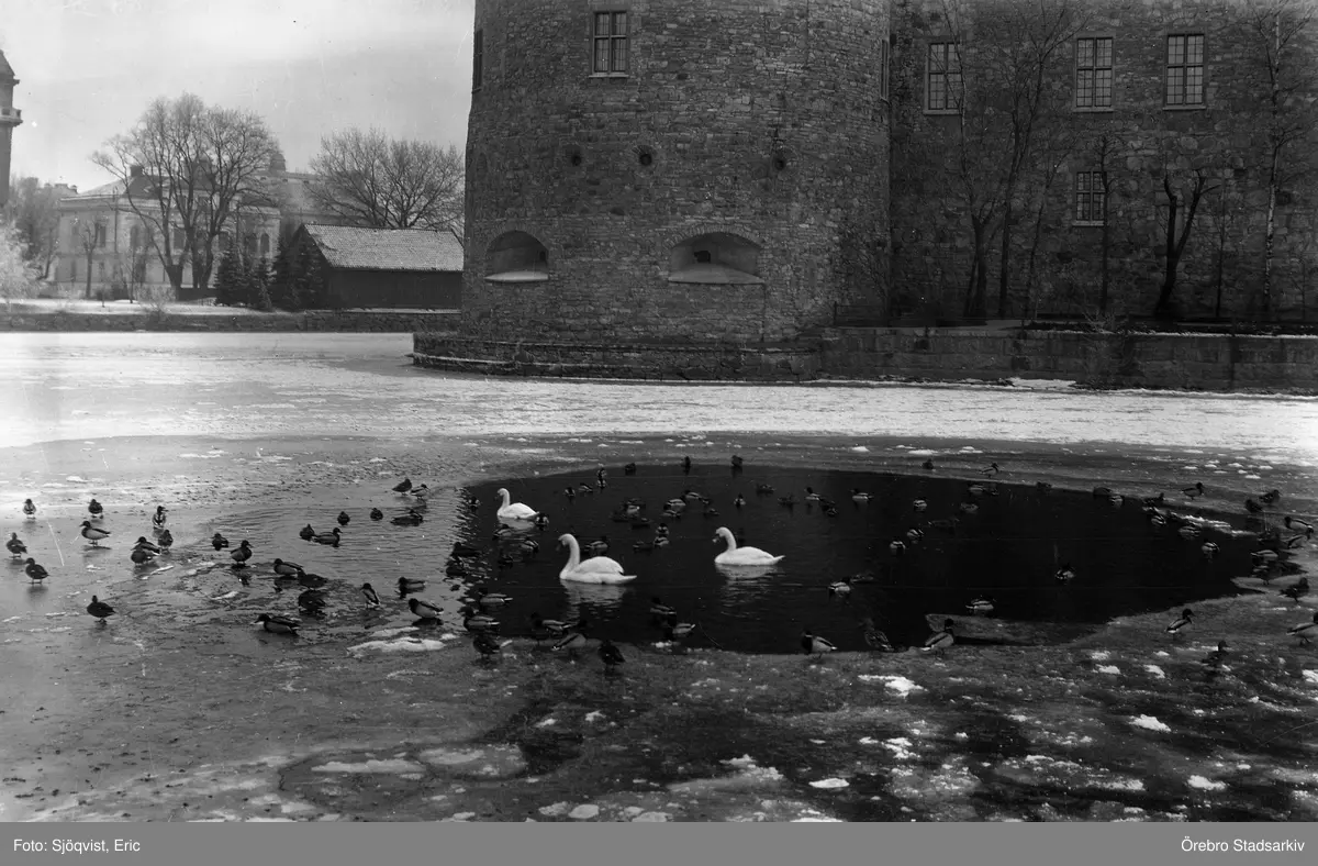 Svanar och ankor simmar i isvak vid Örebro slott, 1930-tal