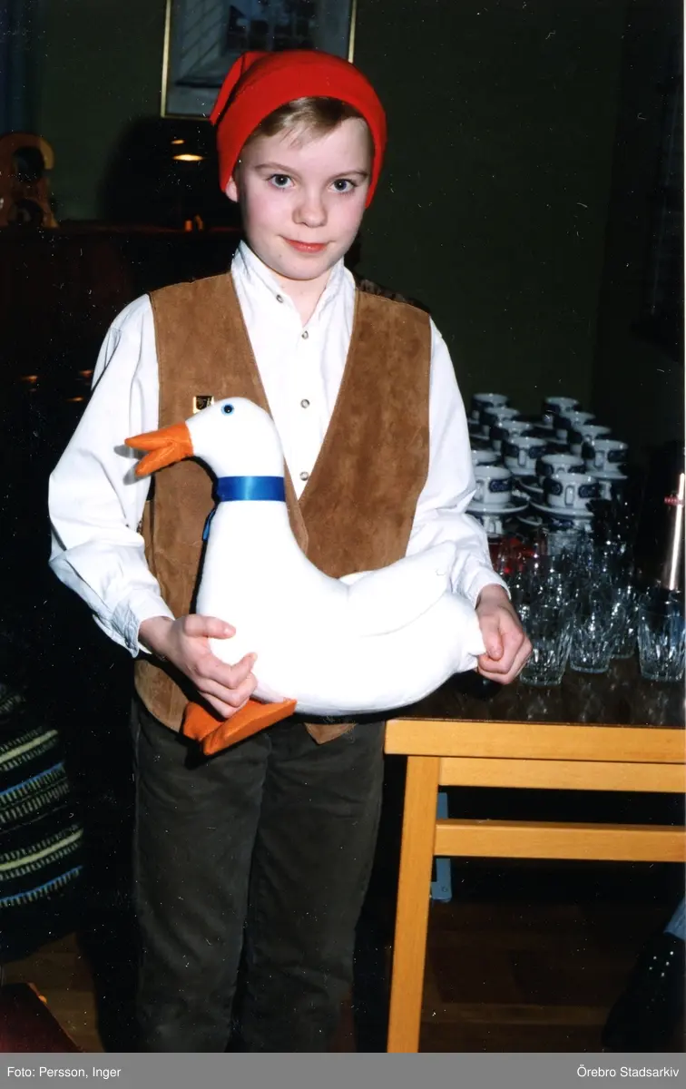 Luciafest i Eker med pojke klädd som Nils Holgersson med gås i famnen, 1995