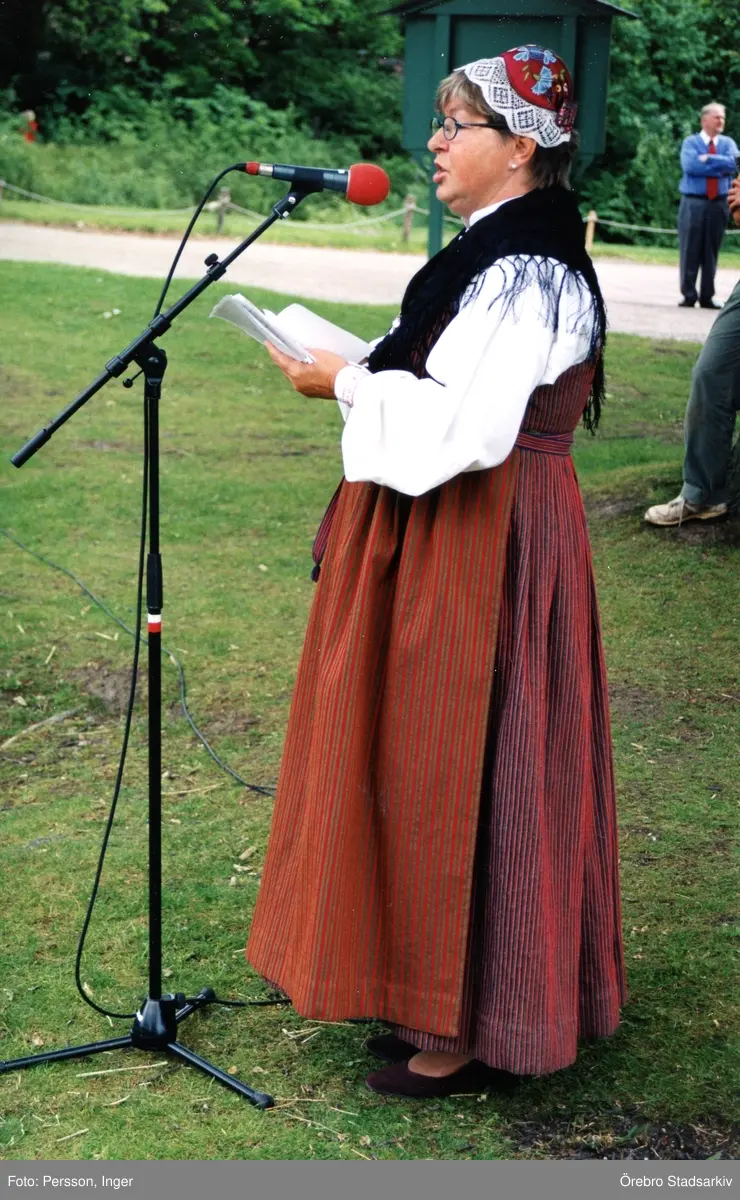 Landshövding Gerd Engman talar på Det stora kakkalaset på Skansen i Stockholm, 1998