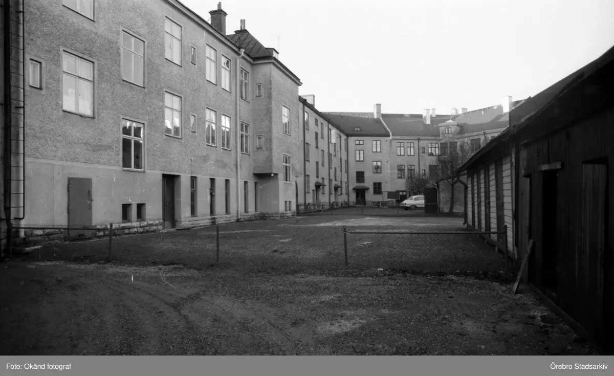 Gårdsbild med staket och uthus på kvarteret Lärkan, 1974