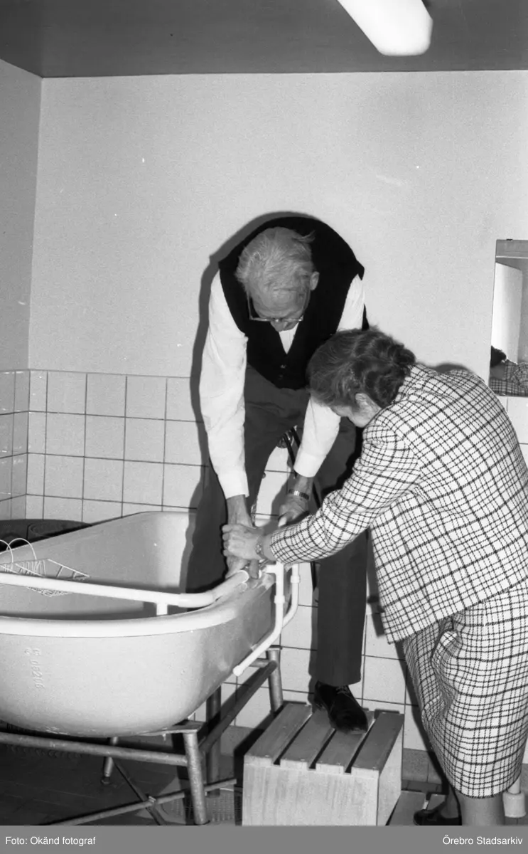 Prövande av handikapphjälpmedel i badrum på Österängshemmet, 1974
