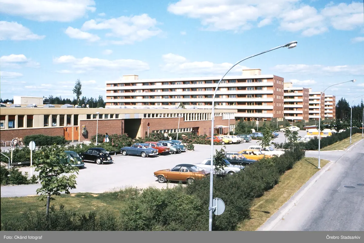 Parkering framför höghuset i Brickebackens centrum, 1990