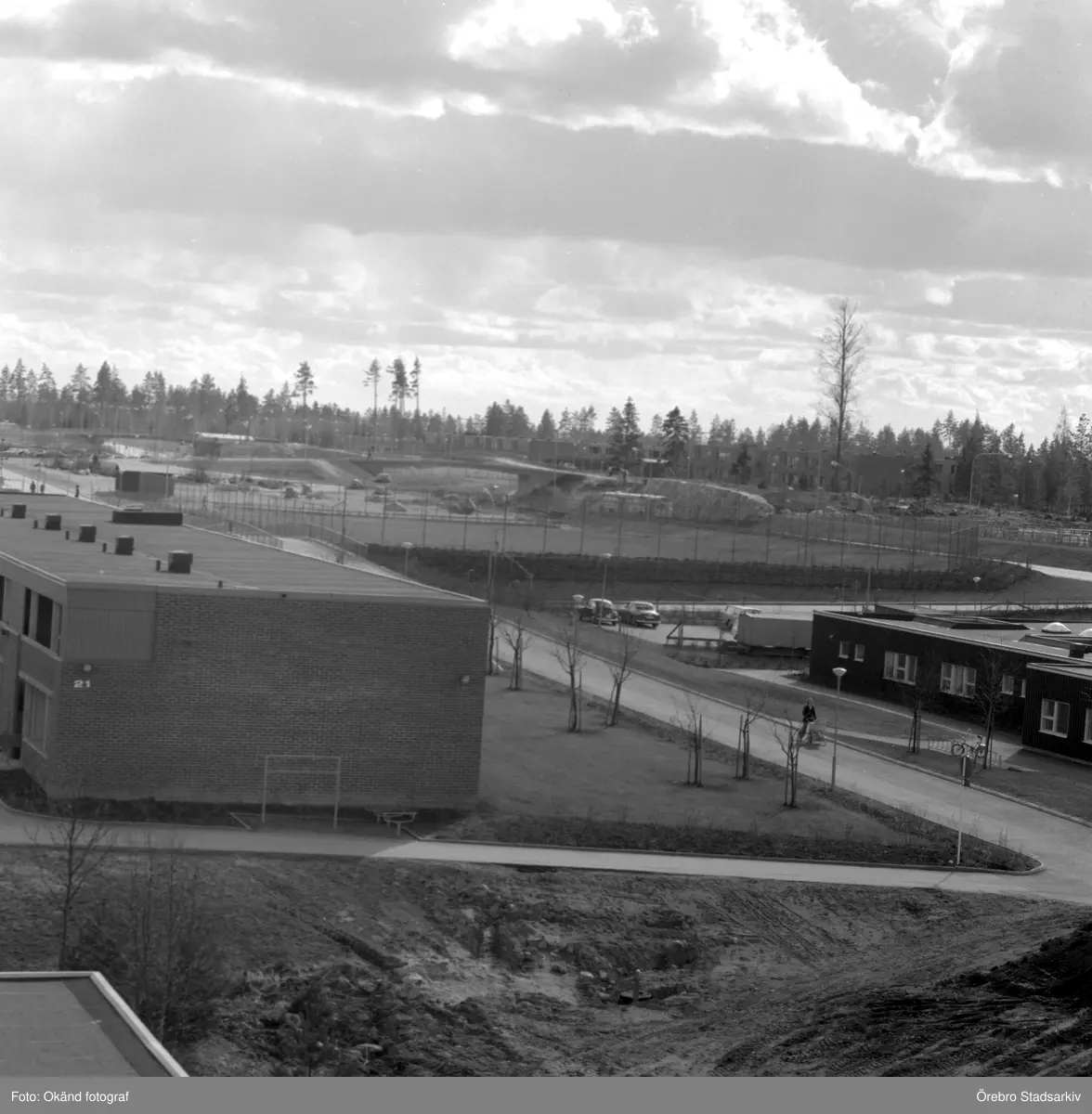 Gångbro och parkering i bostadsområdet Brickebacken, 1970-tal