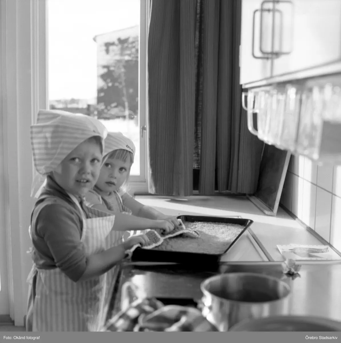 Bakande barn med kaka på plåt på daghem i Varberga, oktober 1967