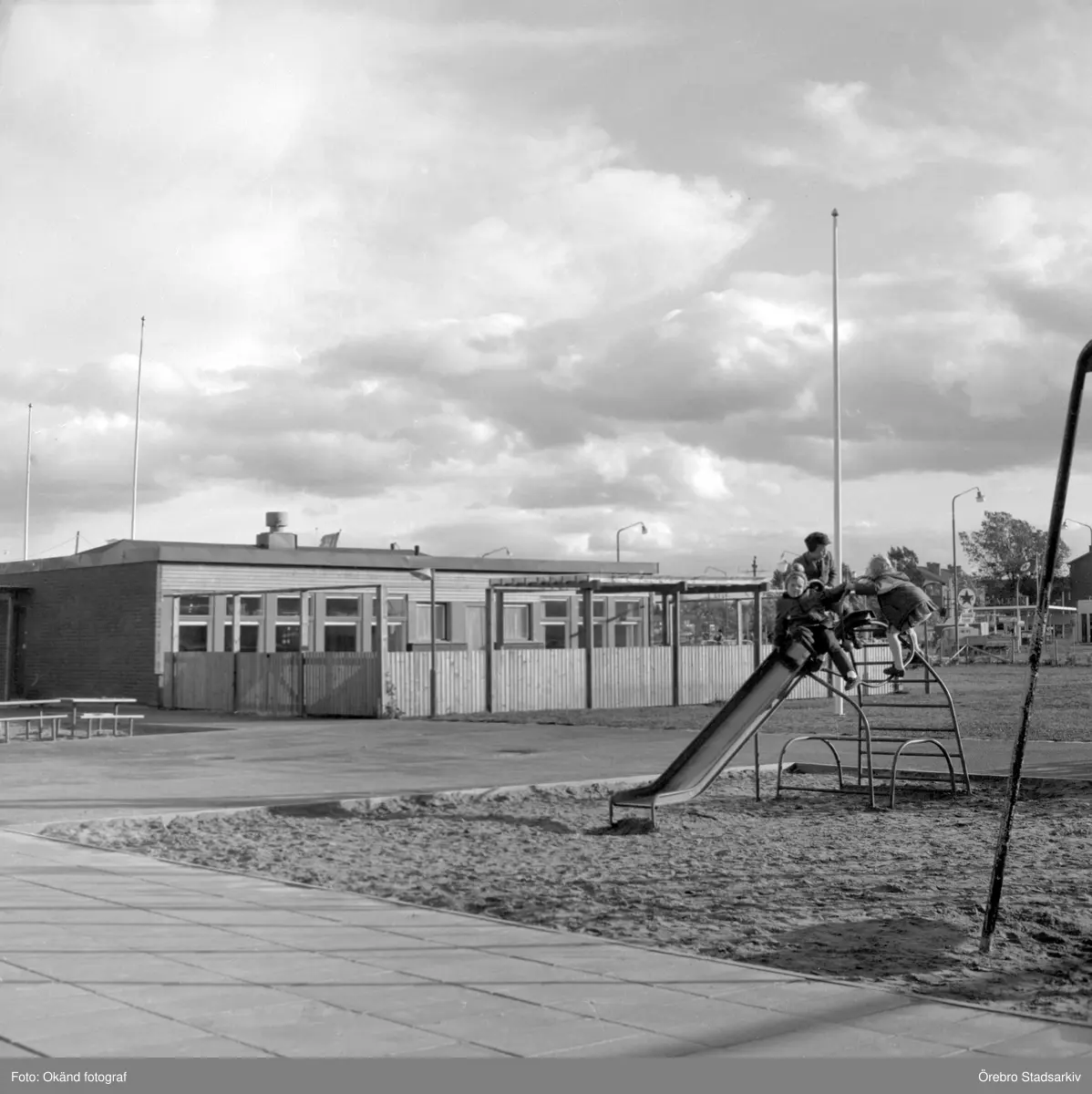 Barn klättrar på rutschkanan vid daghemmet Sidensvansen, oktober 1967