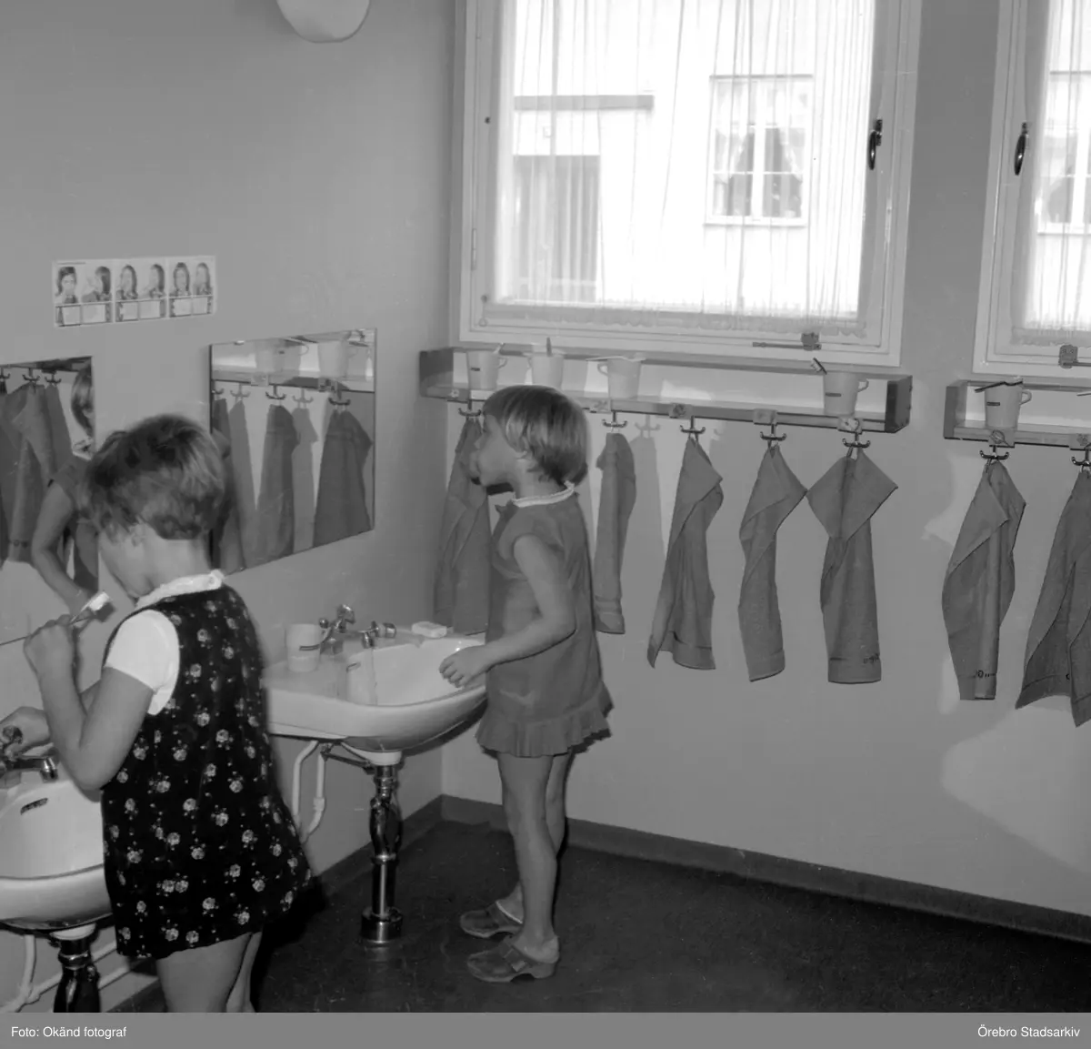 Flickor borstar tänderna på daghemmet Sidensvansen, oktober 1967