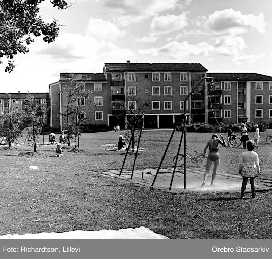 Barn använder utedusch vid Baronbackarna, 1960-tal