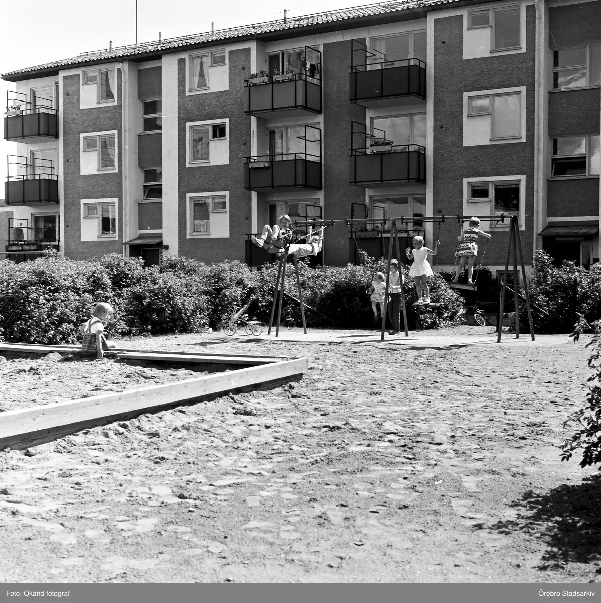 Lekplats med sandlåda och gungande barn i Baronbackarna, 1960-tal
