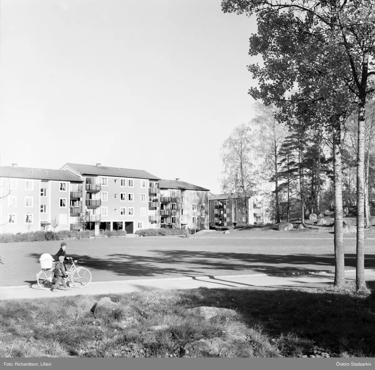 Tvättkorg körs på cykel genom Baronbackarna, 1960-tal