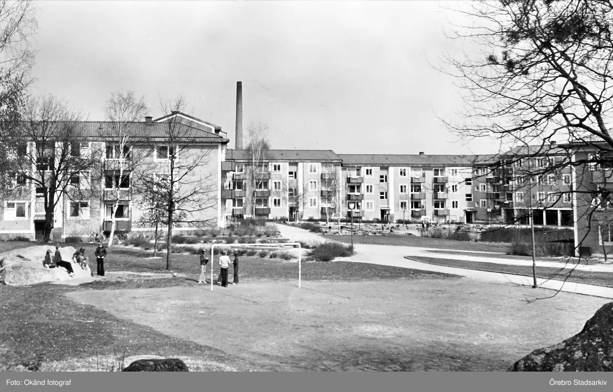Barn på stor sten vid gräsmatta i Baronbackarna, 1960-tal