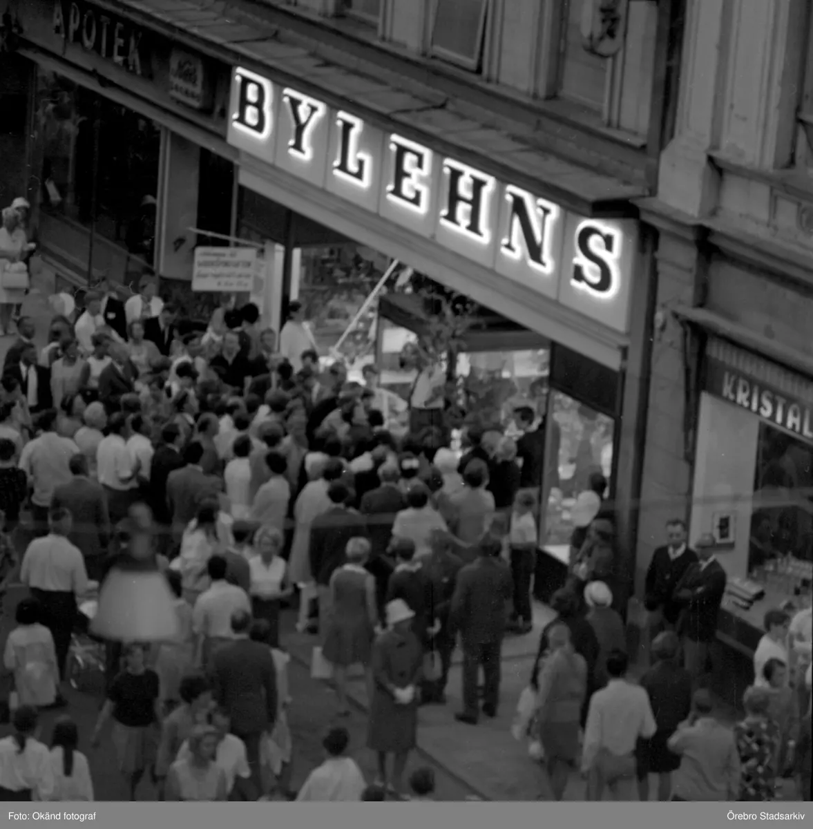 Marknadsbesökare utanför Bylehns på marknadsafton, 1970-tal