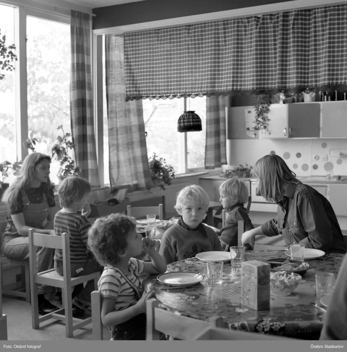 Barnen väntar på sin lunch på daghemmet i Almby, 1970-tal
