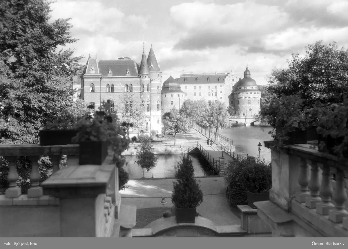 Två damer på Norra strandgatan vid Allehandaborgen i riktning mot Örebro slott, 1930-tal