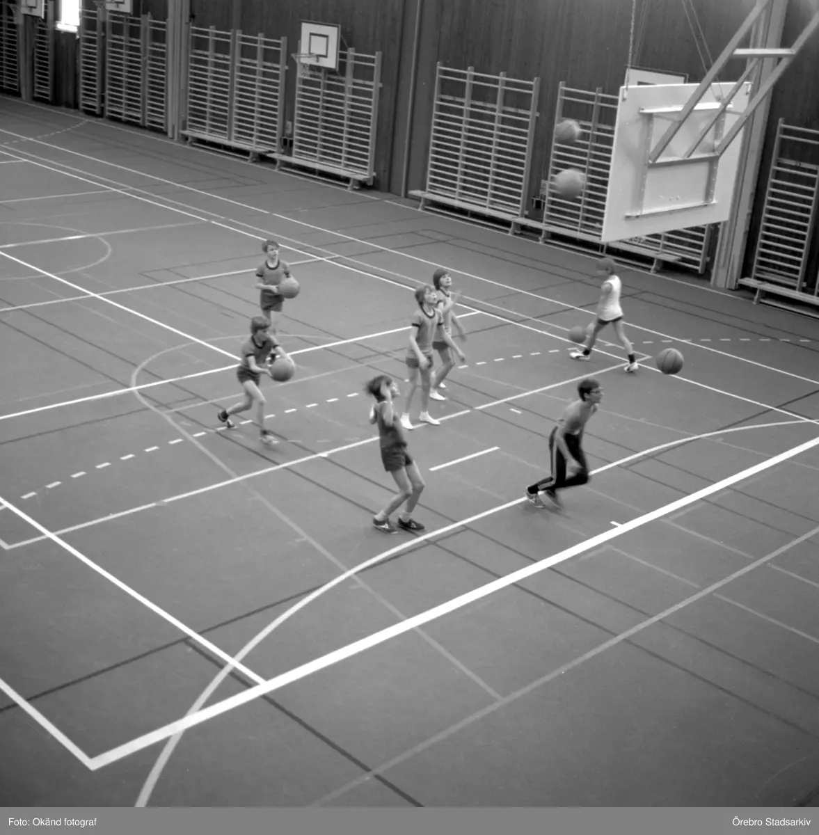 Elever spelar basket i Brickebackens skolas gymnastiksal, 1970-tal