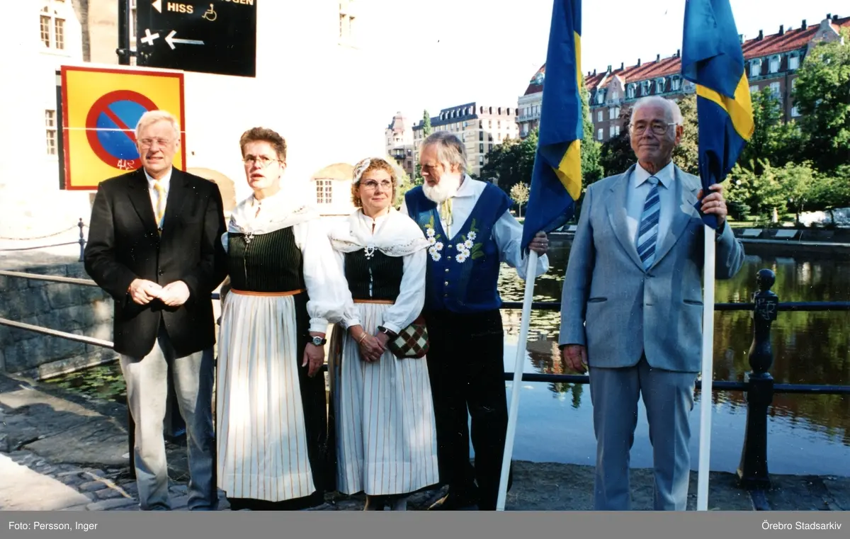 Deltagare från Örebro läns hembygdsförbund och Väster Närkes Hembygdsförening med svenska flaggan vid Örebro Slott, 2002-06-06