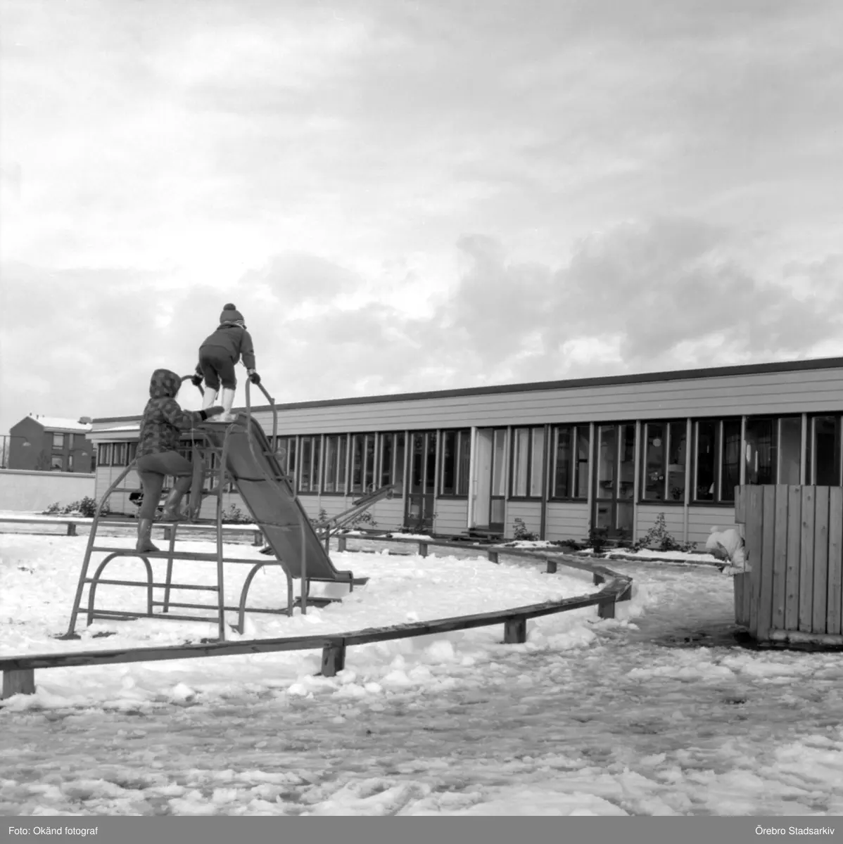 Två barn på rutschkanan och två barn i lekhuset vid daghem i Varberga, oktober 1967