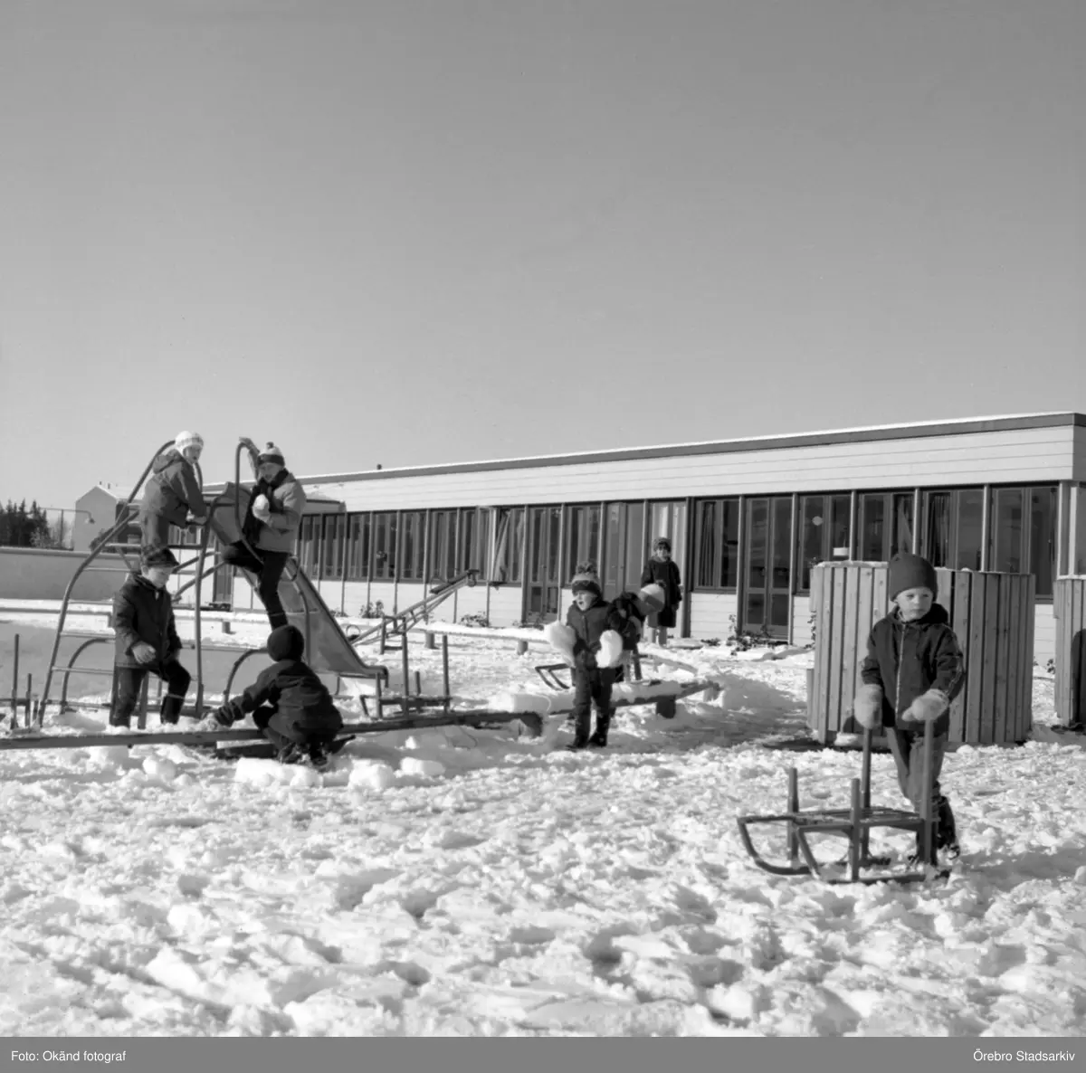 Lekande barn med snöbollar och kälke vid daghem i Varberga, oktober 1967