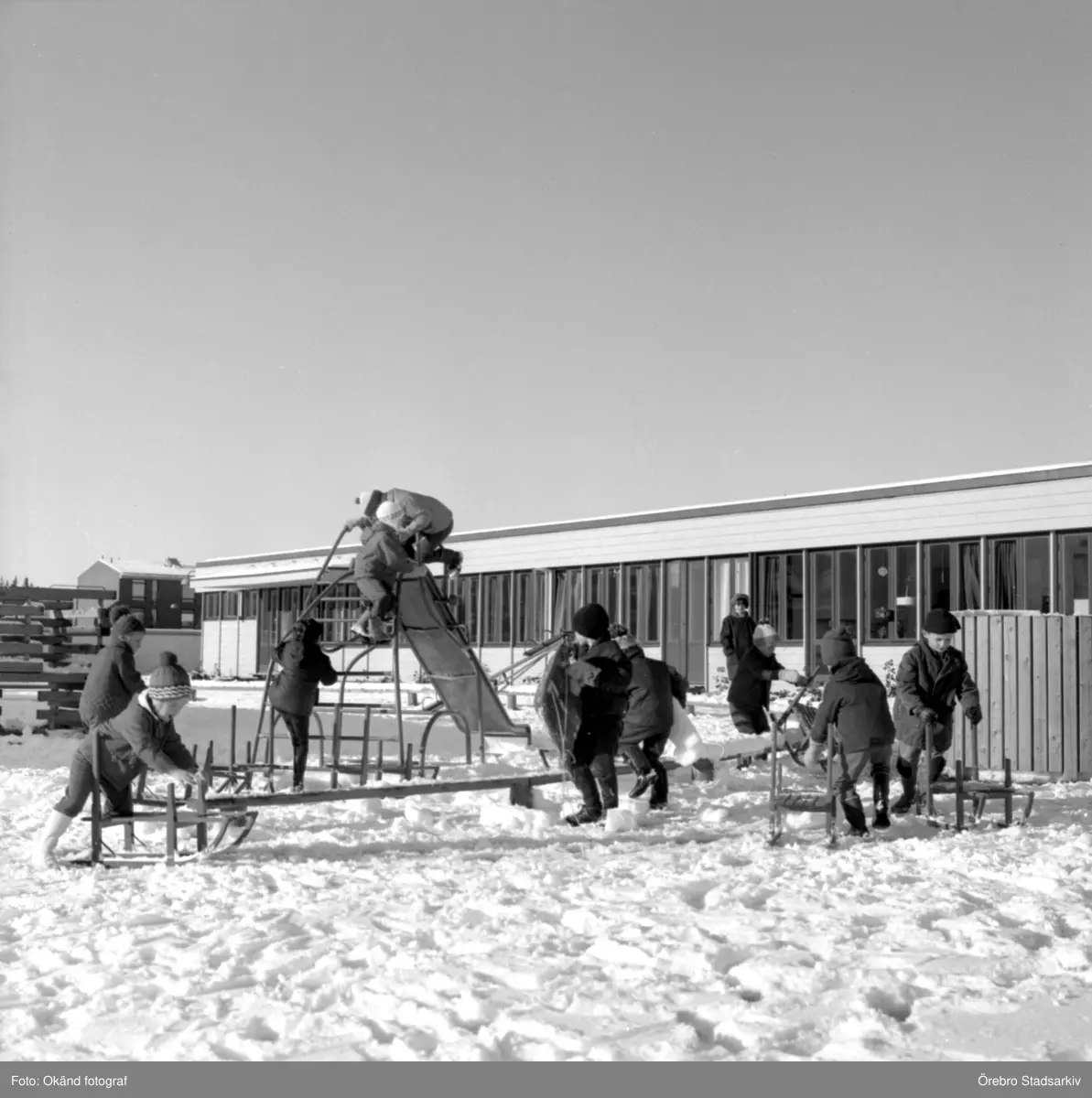 Lekande barn med kälkar vid daghem i Varberga, oktober 1967
