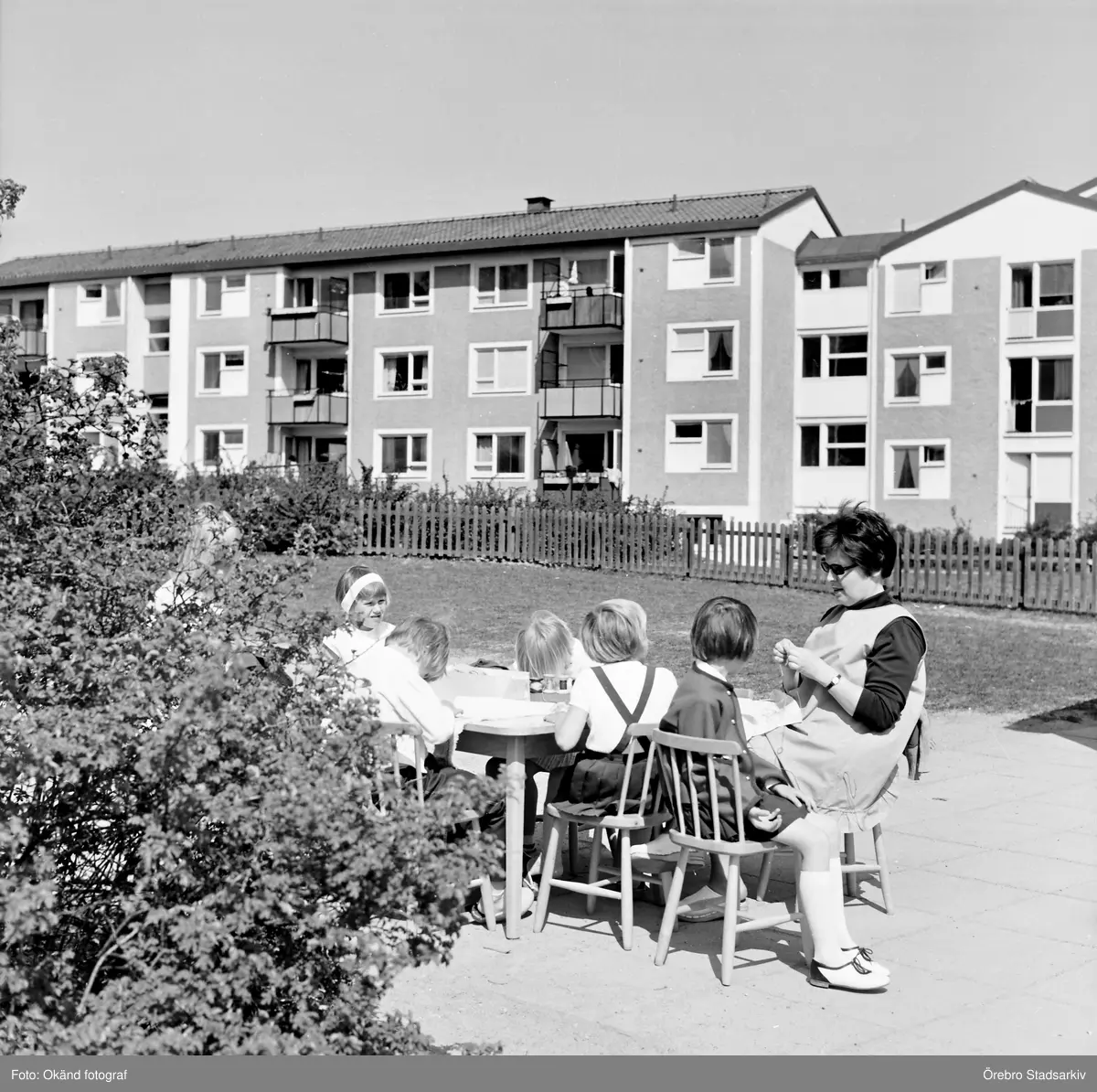Dagisbarn med dagisfröken vid bord utanför daghem i Baronbackarna, 1960-tal