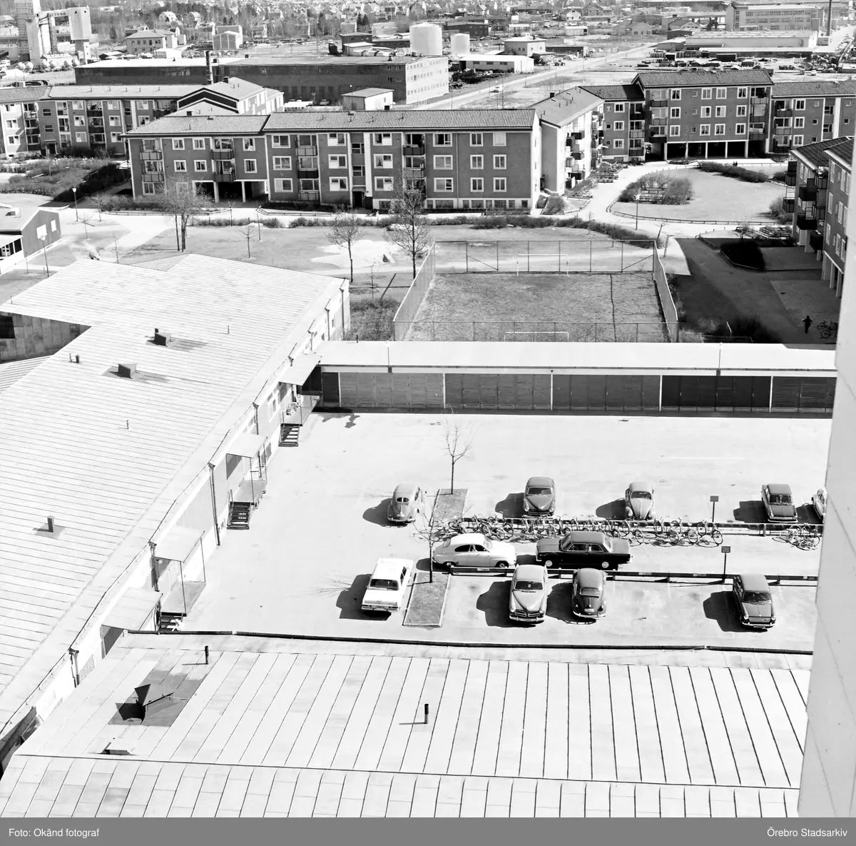 Flygfoto över parkering och hostadshus i Baronbackarna, 1960-tal