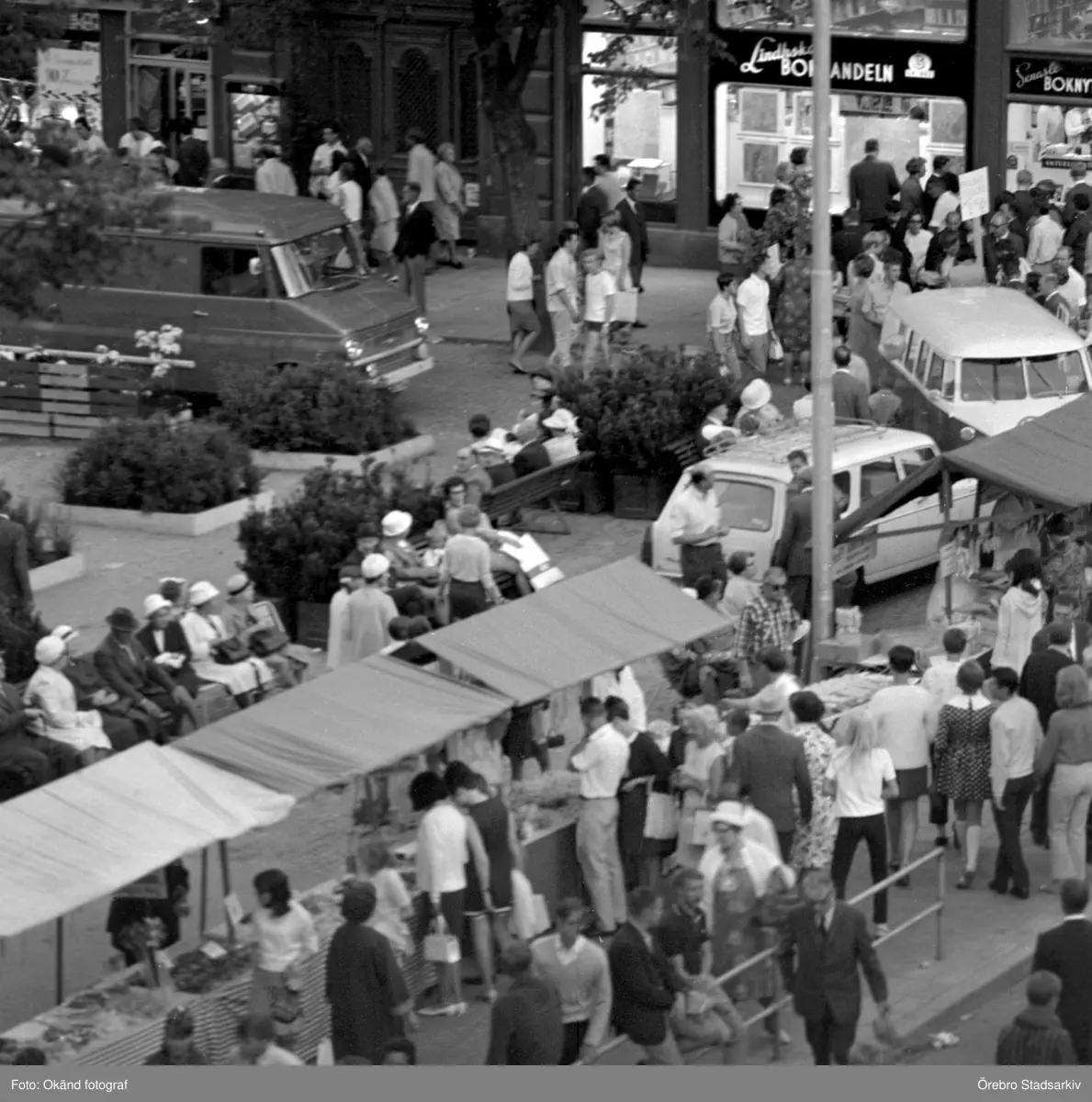 Marknadsstånd vid Stortorget på marknadsafton, 1970-tal