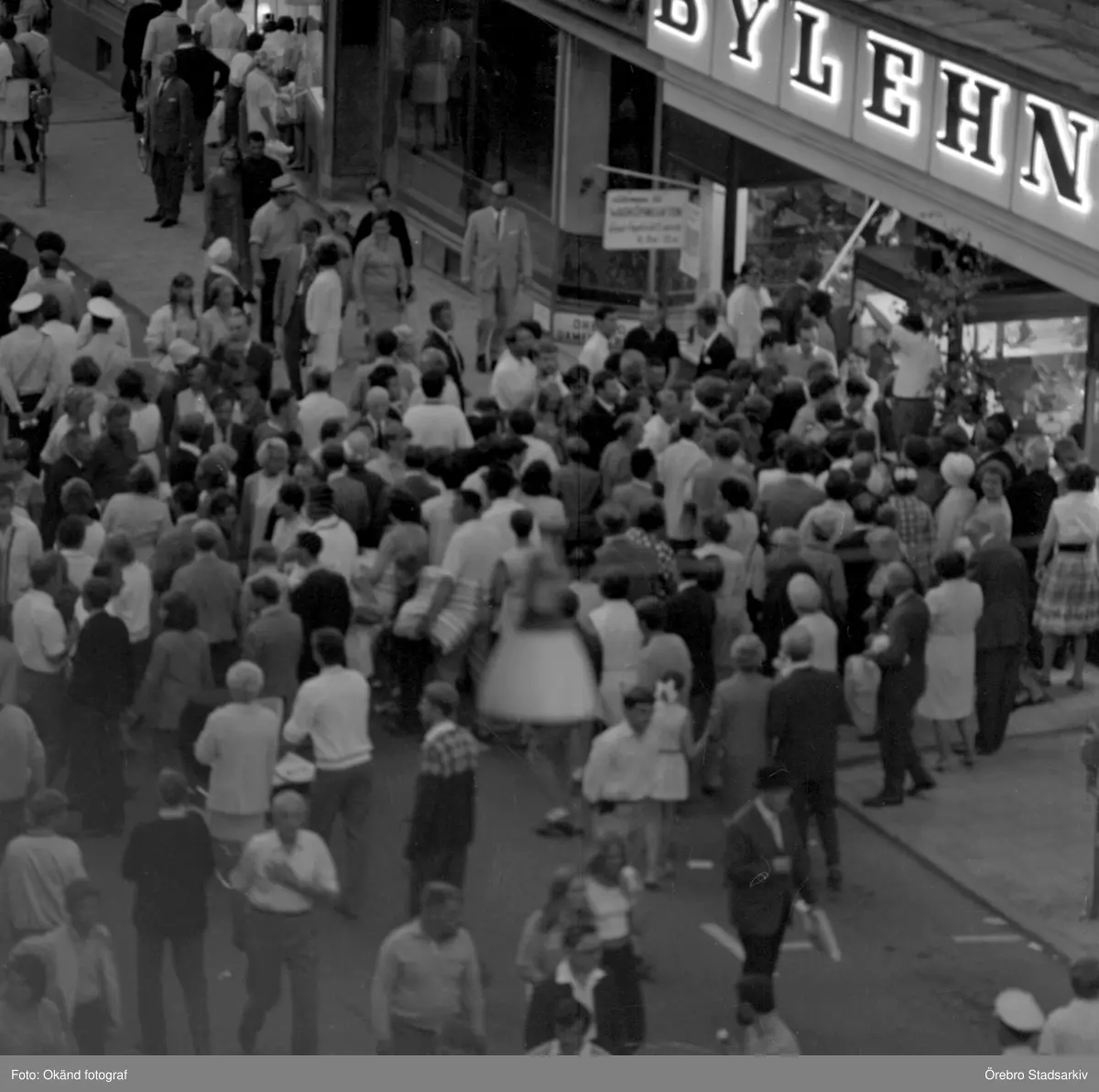 En stor folkmassa utanför Bylehns på marknadsafton, 1970-tal