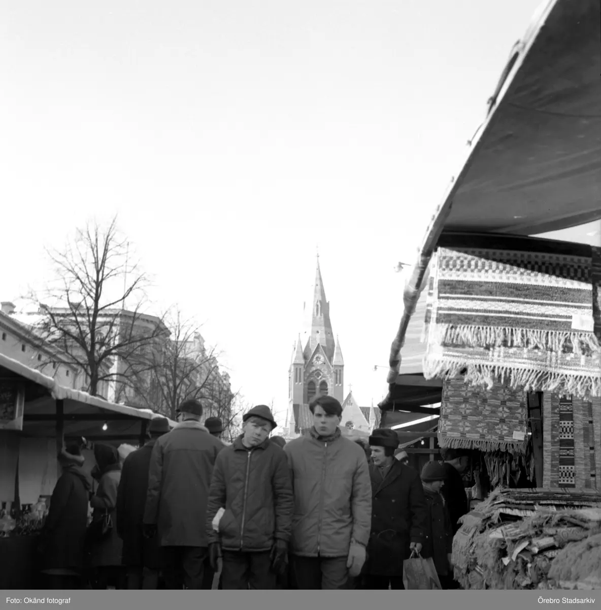 Unga besökare går förbi mattförsäljningen på Hindersmässan, 1960-tal