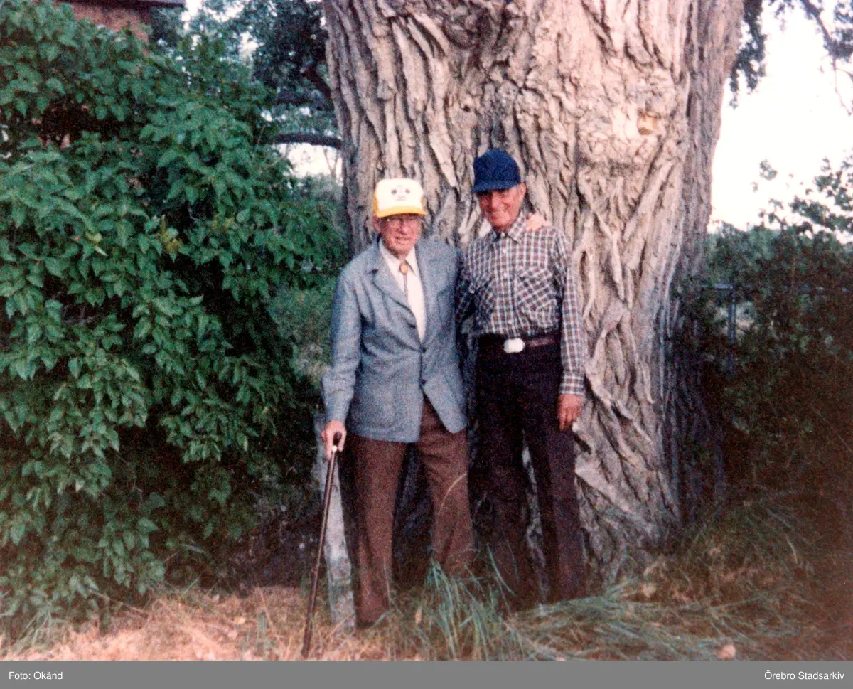 Två män framför trädet som deras far planterade på farmen han köpte i Billings, Montana i USA, 1982