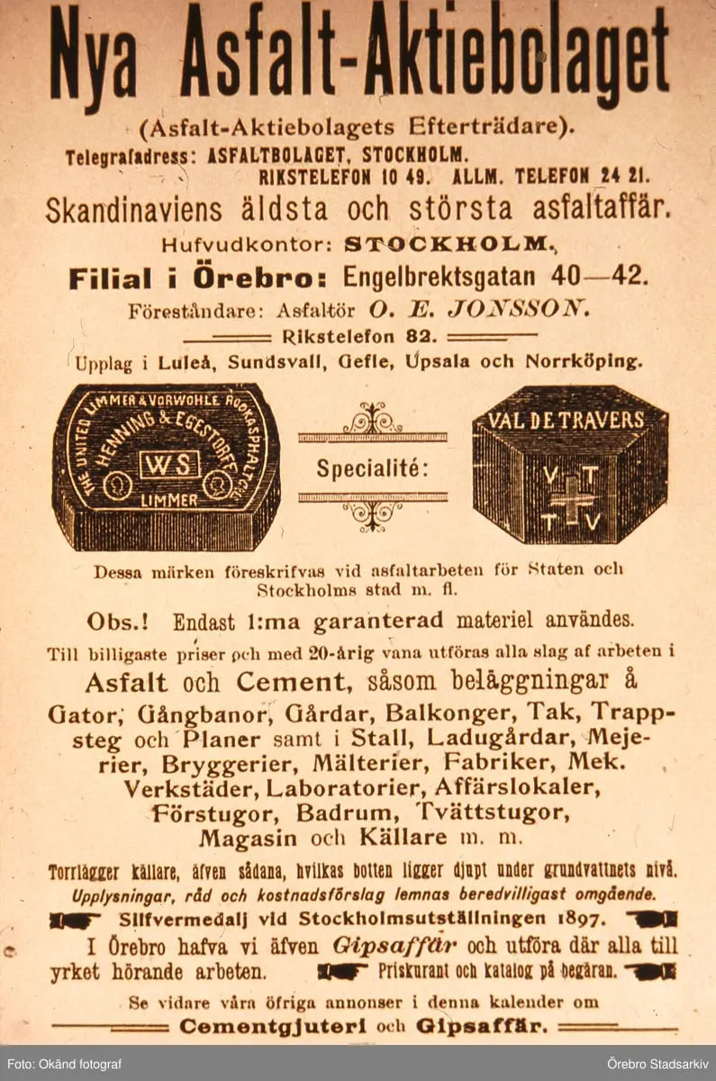 Annons för Nya Asfalt-aktiebolaget i Örebro adresskalender, ca 1900