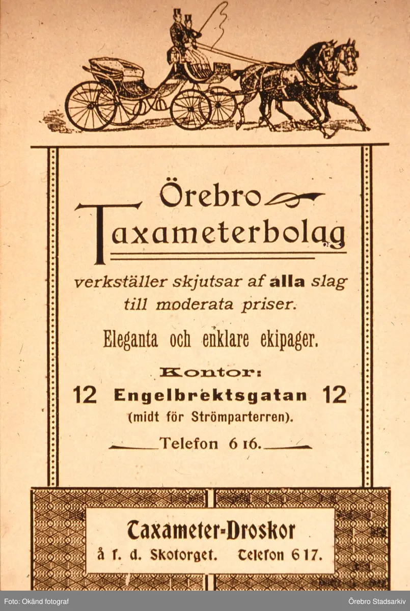 Annons för Örebro Taxameterbolag på Engelbrektsgatan 12, ca 1900