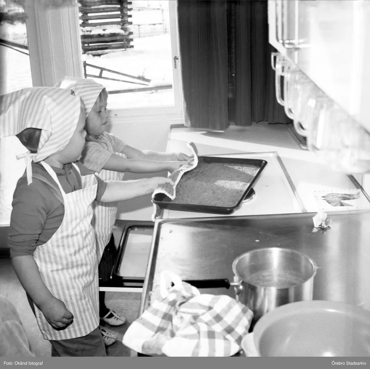 Bakande barn med ungsplåt på daghem i Varberga, oktober 1967