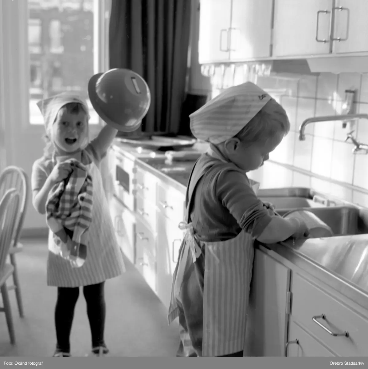 Barn diskar och torkar på daghem i Varberga, oktober 1967