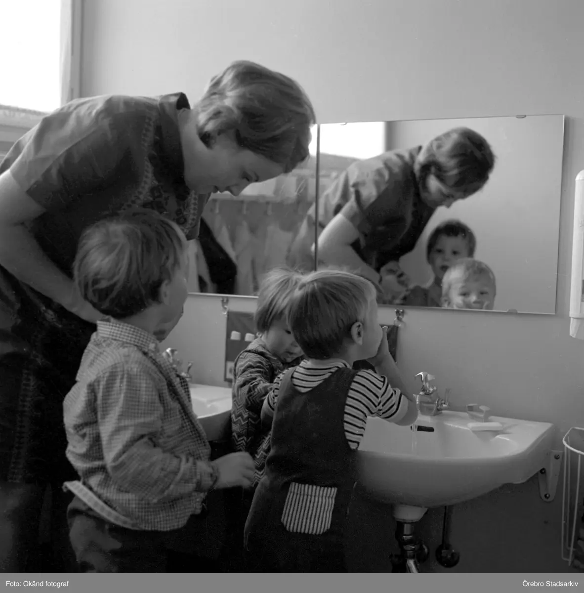 Dagisfröken med barn i badrummet på daghemmet Sidensvansen, oktober 1967