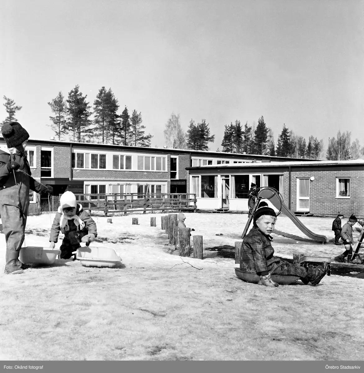 Barn åker pulka vid daghemmtet i Vivalla, oktober 1967