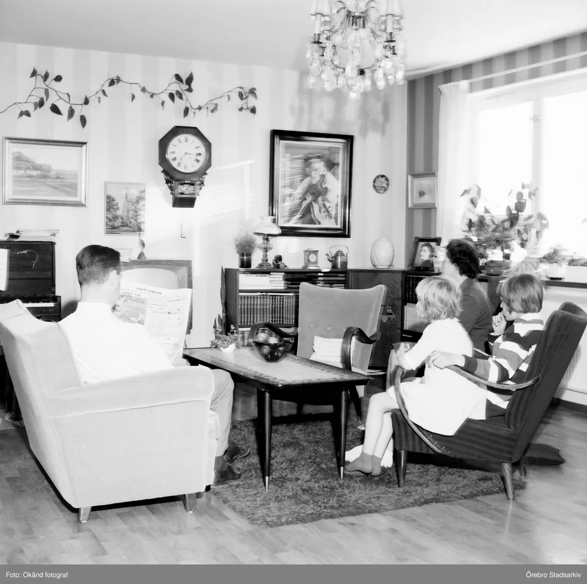 Familjen Enbrant samlad framför tv-apparaten i vardagsrummet i Baronbackarna, 1960-tal