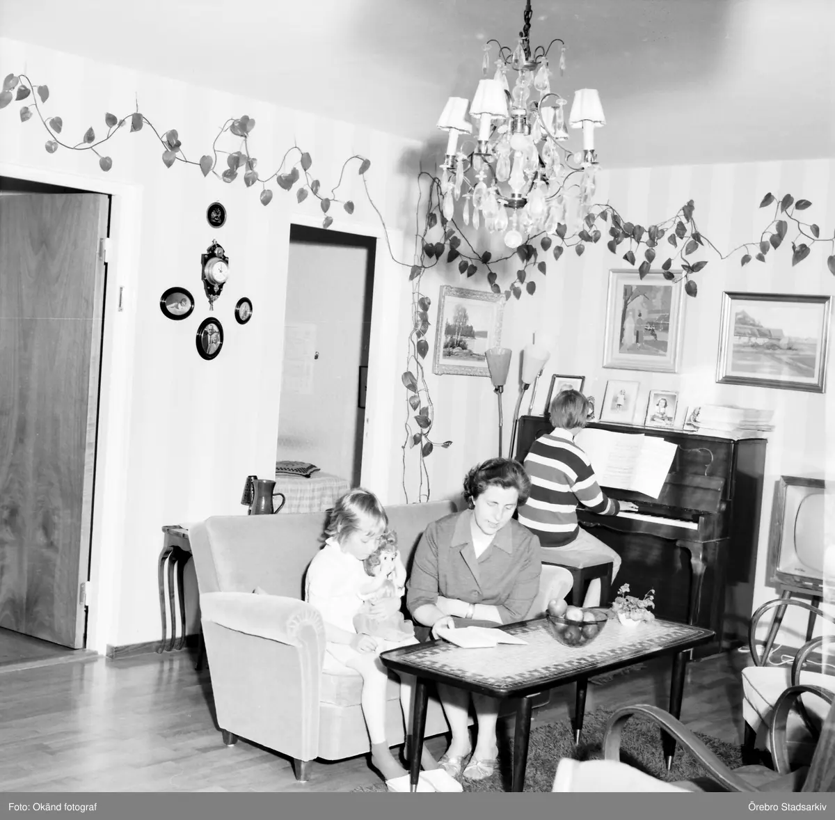 Familjen Enbrant spelar och läser i vardagsrummet i Baronbackarna, 1960-tal