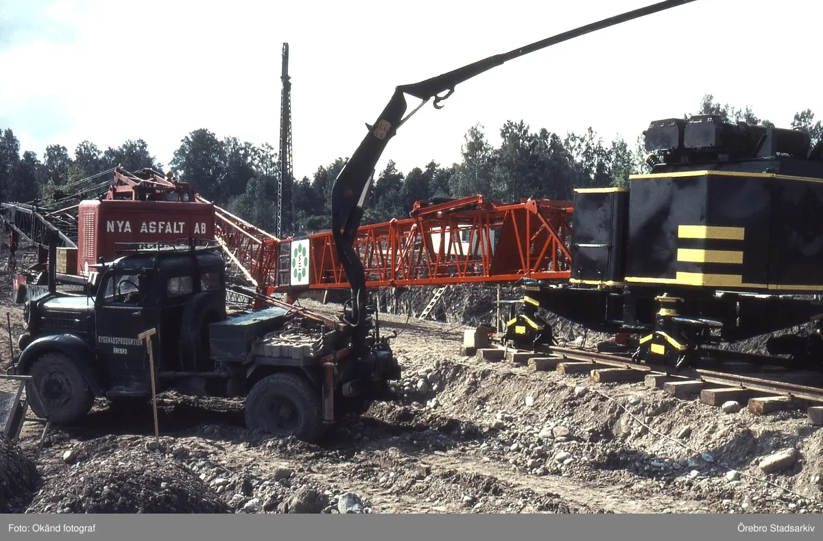 Kranbil och lyftkran vid byggnation av bostadsområdet Vivalla, 1966-1971
