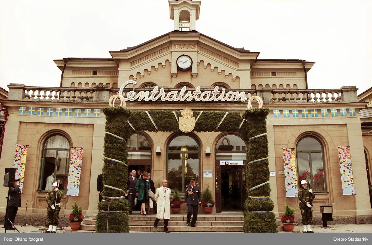 Kung Carl XVI Gustaf med följe kommer ut från centralstationen vid invigning av Mälarbanan, 1997-10-13