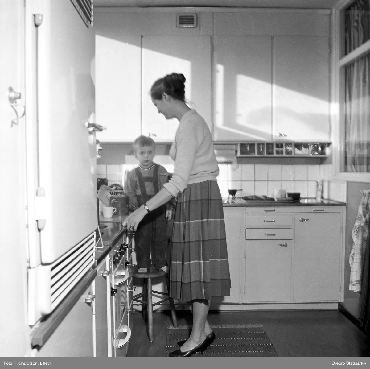 Kerstin Olson förmanar sonen Lars i köket i Baronbackarna, 1960