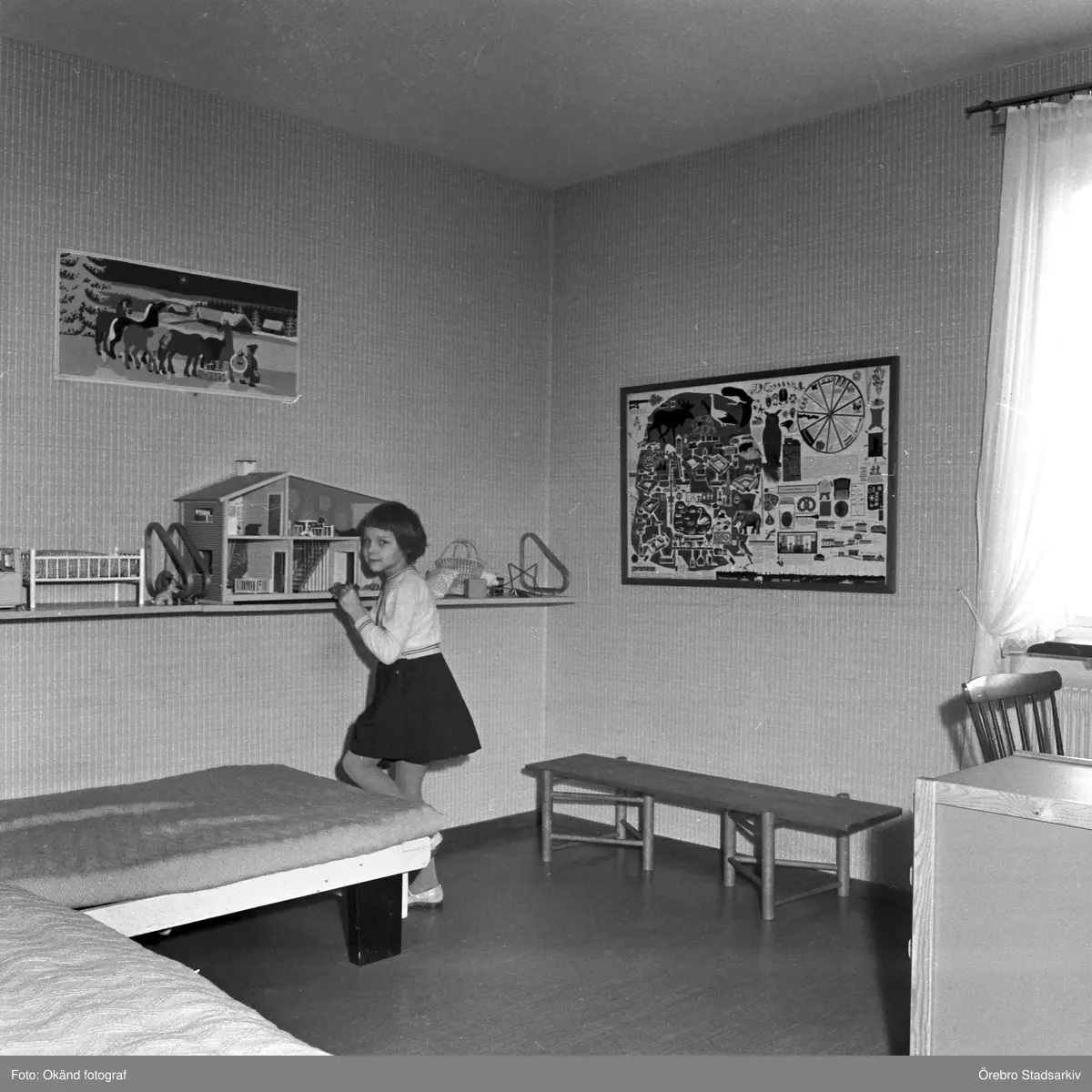 Anna visar sitt doclskåp i barnrummet i Baronbackarna, 1960-tal