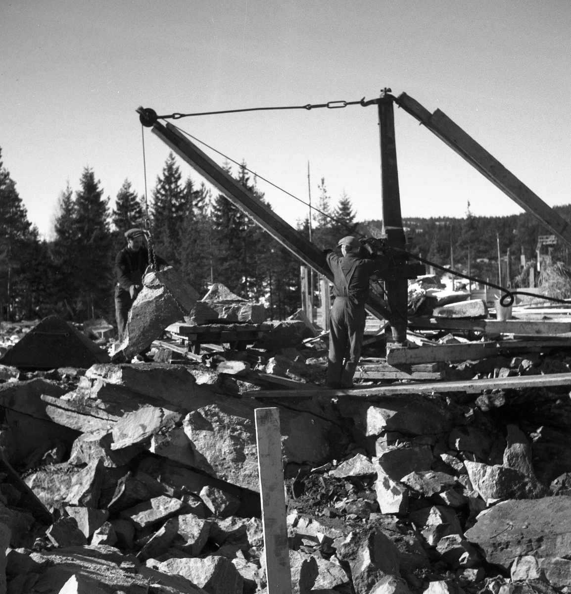 Titel: Bildserie tagen 1947 som visar mark- och grundarbeten inför starten av byggandet av etapp 2 av kooperativa förbundets Svenska Rayon-anläggning i Vålberg. Grumsföretaget Byggnads AB Nordolf antogs som entreprenör för arbetet.
