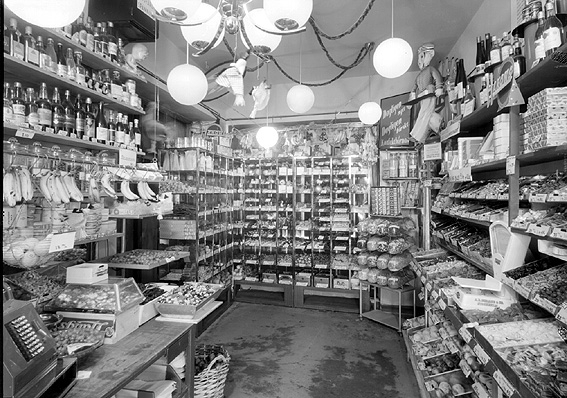 Interiör från Wikströms affär som låg i den ännu kvarstående fastigheten i hörnet Långgatan-Bergslagsgatan. Bilden från 1937.