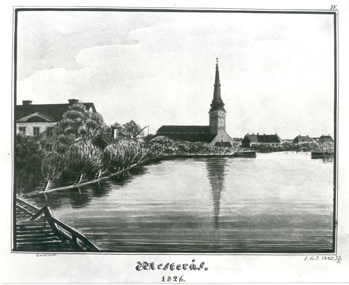 Tavla med parti av Svartån mot söder, med Domkyrkan.